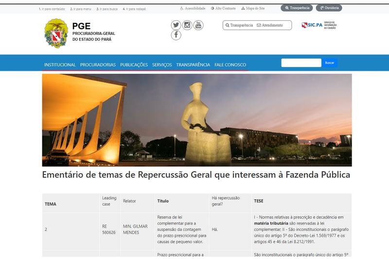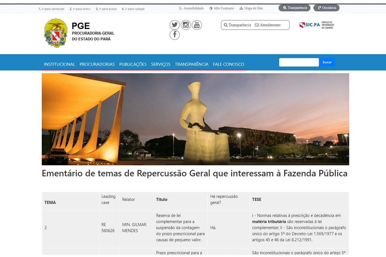 A Procuradoria-Geral do Estado do Pará (PGE) disponibilizou uma nova ferramenta em seu site: um compilado de decisões e temas em análise pelo Supremo Tribunal Federal (STF) que afetam diretamente os interesses do Estado. A iniciativa busca facilitar a consulta por procuradores e demais operadores do direito, garantindo que a atuação do Governo esteja sempre alinhada às decisões mais recentes da Justiça.