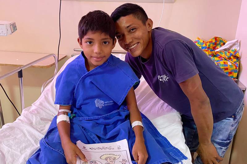 Leandro Aquino dos Santos ao lado do filho, Joabe, reconhece o empenho da equipe multiprofissional do HRPM Aprovação - Leandro Aquino dos Santos, 30 anos, acompanha o filho Joabe Ramos dos Santos, 8 anos, internado na Clínica Pediátrica, aprova o atendimento na unidade. “Os profissionais atendem o meu filho muito bem. O atendimento é humanizado. Nos sentimos seguros durante todo o atendimento, e ele tem apresentado uma boa melhora. Tem até um espaço especial para as crianças internadas, a Brinquedoteca, que ele gosta muito. Até na alimentação, que ele é bem exigente, está gostando. Eu vejo o Hospital como de alta capacidade. Indico muito o atendimento, pois somos bem tratados aqui”, afirmou o autônomo.