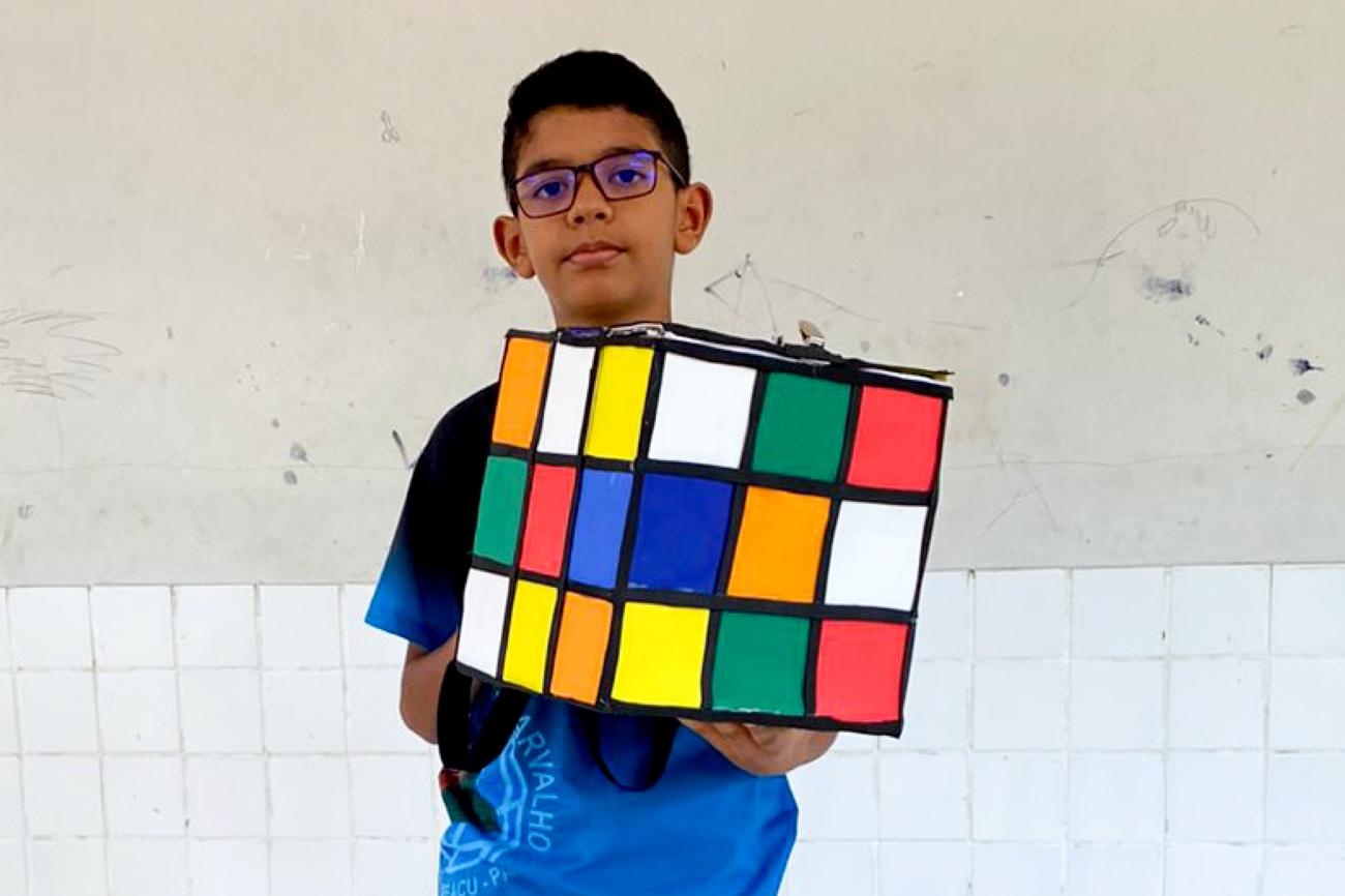 O estudante João Guilherme, de 12 anos, usou a forma geométrica de um cubo, caracterizado como um poliedro de 6 lados, que possui todas as faces quadradas. “Tive como inspiração o ‘cubo mágico’ e eu gostei de fazer essa atividade porque utilizamos a nossa criatividade e imaginação. Aprendemos que podemos fazer qualquer coisa através das formas geométricas. Utilizamos materiais reciclagem para fazer algo de utilidade, que usamos no nosso dia a dia. Quero agradecer a professora Raquel por esse desafio de aprender algo novo”, declarou.