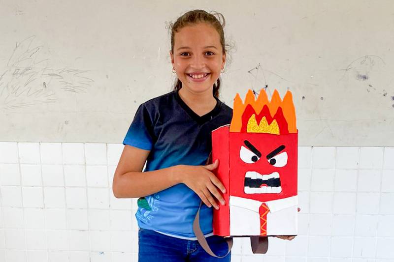 Outro trabalho apresentado durante o desfile das mochilas na escola foi do aluno Guilherme Lins, também de 12 anos. Com a ajuda dos pais, ele confeccionou um robô, utilizando formas e tamanhos diferentes. “Eu achei a experiência interessante, pois fui desafiado a usar a minha criatividade para fazer uma mochila maluca com formas geométricas. Confesso que foi trabalhoso, mas foi divertido. Até envolvi meus familiares: meu pai, minha mãe e meu irmão. Na mochila que produzi podemos ver as formas de quadriláteros e círculos”, disse.