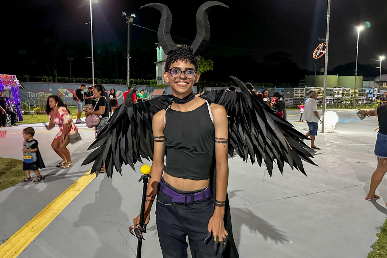 Estudante, Elizeu Ferraz, de 16 anos, também gostou da programação lúdica: "Achei legal porque diverte as crianças".Já o estudante Elizeu Ferraz, de 16 anos, conta que demorou dois dias para fazer uma fantasia inspirada no filme “Malévola”. “Eu fiz a asa da fantasia, mas não deu certo, tive que refazer, levei dias, mas ficou pronto. Achei legal essa programação porque é algo que muitas crianças se divertem”, contou.