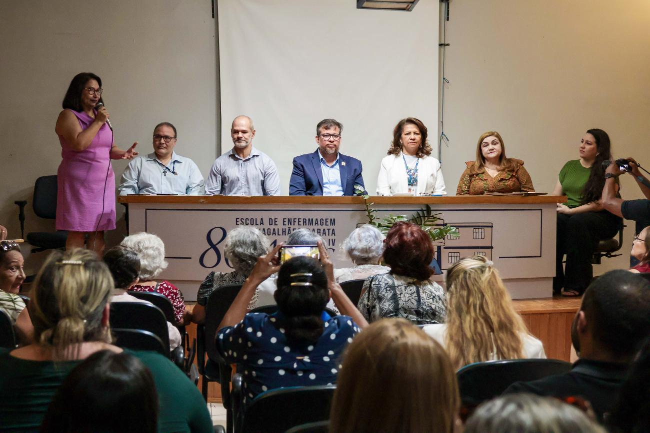Reconhecida como referência na formação em Enfermagem, a Escola Magalhães Barata também se destaca pelos programas de pós-graduação, com mestrado e o primeiro doutorado em Enfermagem da região Norte, a fim de aperfeiçoar o conhecimento e promover a pesquisa científica na área da saúde, em parceria com a Universidade Federal do Amazonas (Ufam).Autoridades presentes à comemoração