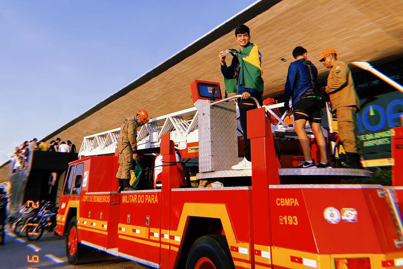 Leonardo de Brito Nogueira e outros atletas apoiados pela Seel desembarcaram na capital paraense no último sábado (02), e foram recebidos no Aeroporto de Belém com festa. Os atletas seguiram em carro do Corpo de Bombeiros até a Academia Machida, no bairro de Nazaré, aonde foram homenageados por familiares e amigos.