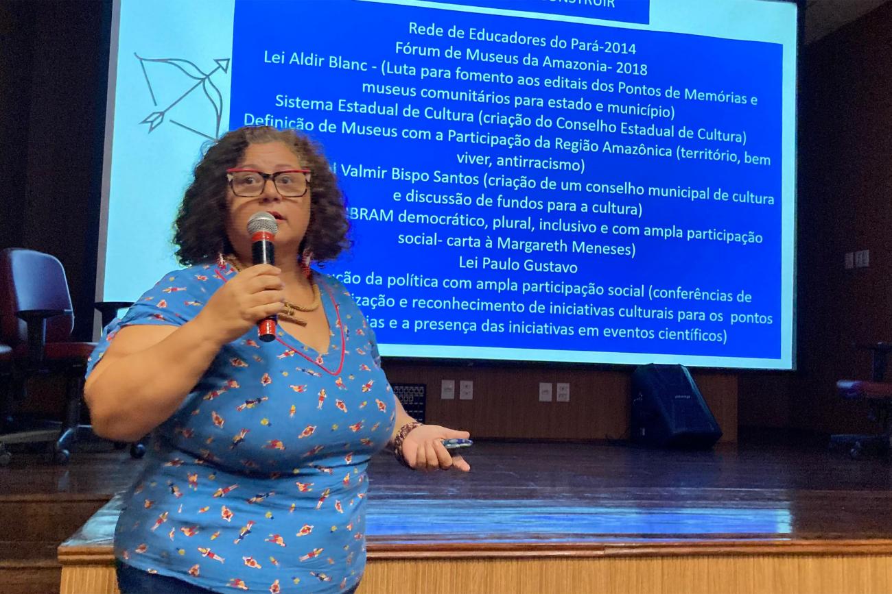 A primeira palestra do dia, com o tema "Museologia Social e Participação Comunitária", foi ministrada pela Profa. Dra. Lúcia Santana do Museu Paraense Emílio Goeldi e Fórum de Museus da Amazônia. "A discussão que estamos propondo aqui é sobre essa política museológica e principalmente a questão da participação social, envolvendo os movimentos culturais, que estão em busca de ter empoderamento em relação às suas vozes e suas representatividades, e também ver a forma de como que eles estão 'musealizando' o mundo", conta Lúcia.