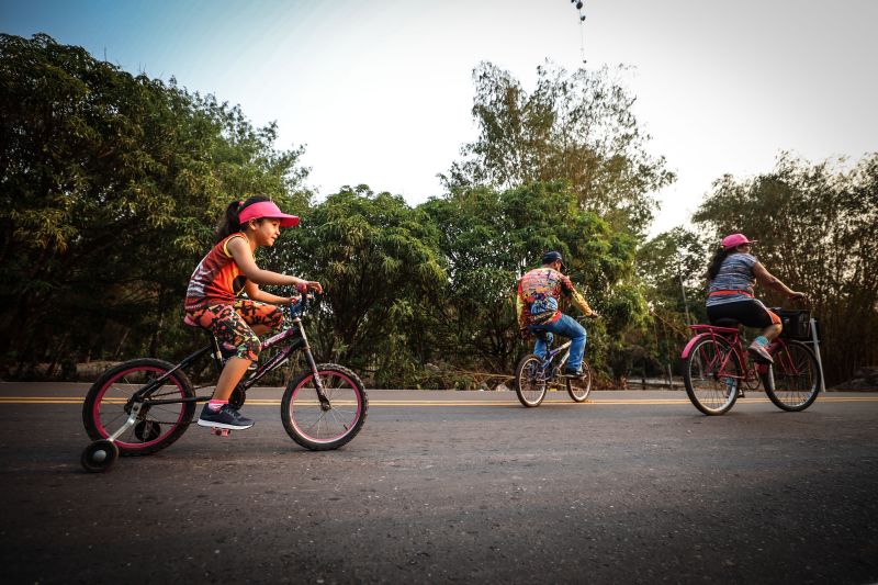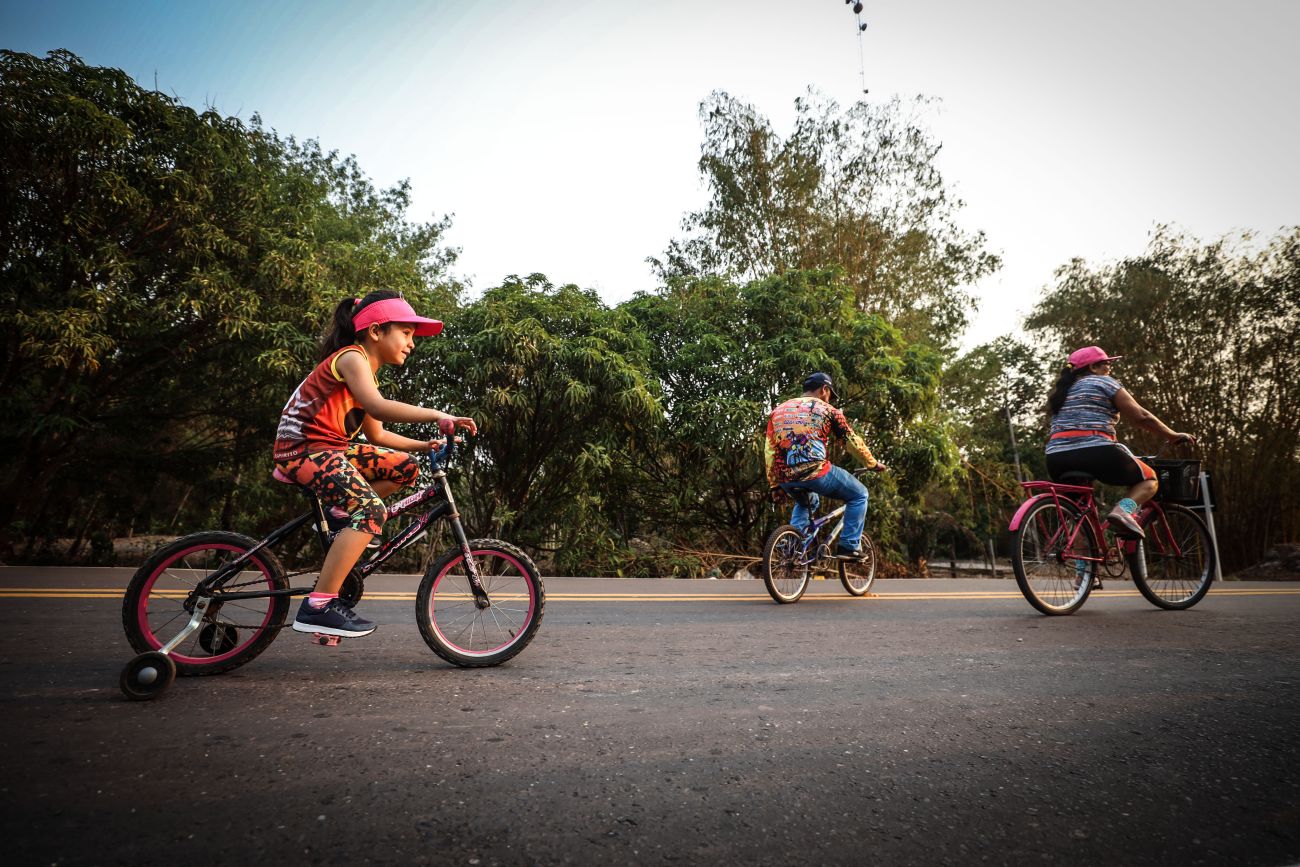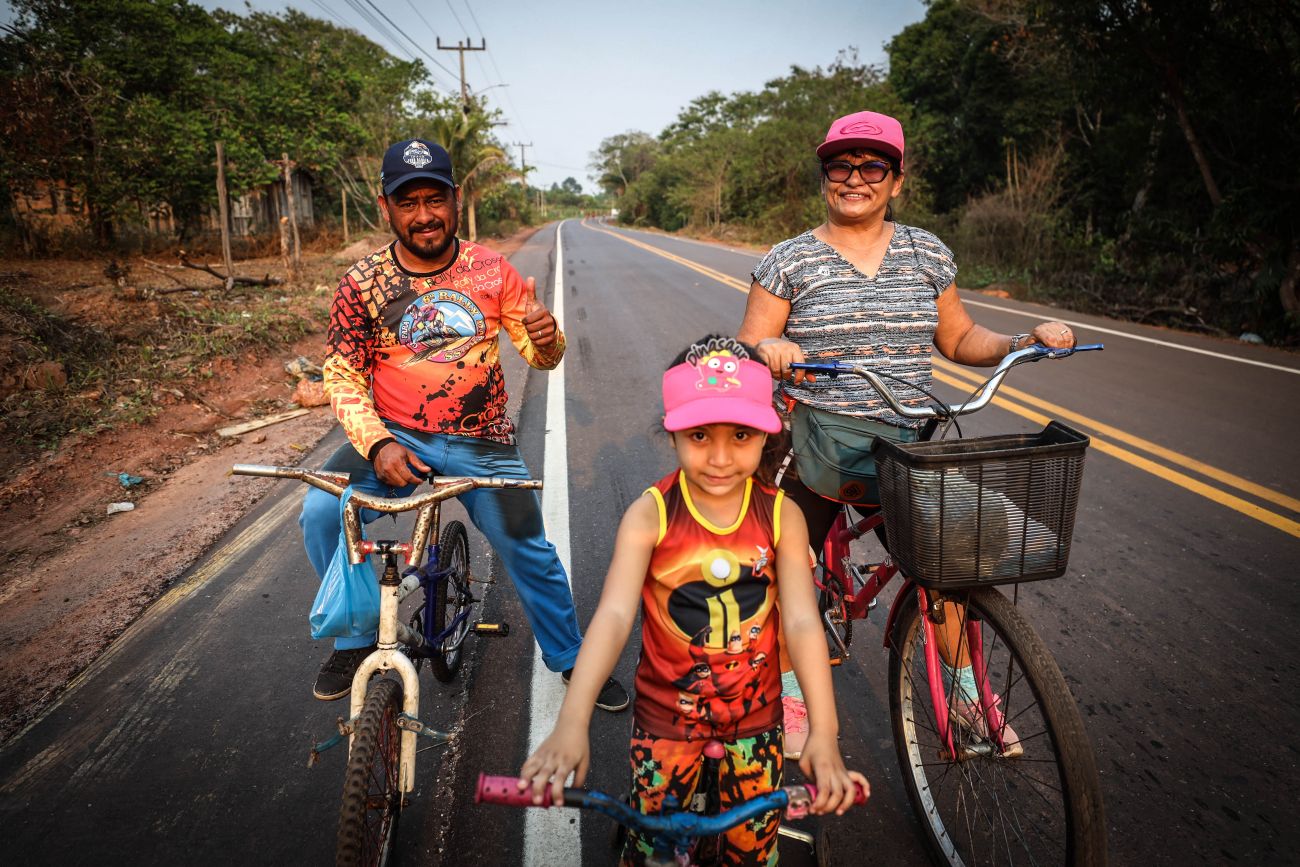 João Pedro com a esposa Rosilma Veiga e a filha do casal, Laura: "Era um sonho, agora estamos aproveitando agora" A vendedora Rosilma Veiga estava com o marido e a filha, a pequena Laura, de 4 anos, pedalando de bicicleta no asfalto novo. “Nossa estrada está pronta, temos muito o que agradecer porque era um sonho que a gente achava que estava muito longe, mas graças ao governo a estrada já está pronta, agora estamos aqui aproveitando para andar de bicicleta em segurança”, avaliou a moradora.