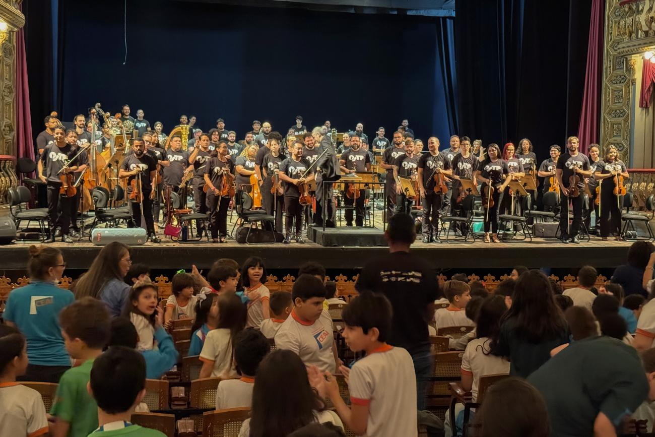 Na manhã desta terça-feira, 12, a Orquestra Sinfônica do Theatro da Paz (OSTP), fez uma apresentação dedicada a estudantes. O concerto com repertório "músicas de cinema" foi pensado, especialmente, para cerca de 300 alunos das escolas Seeds Bilingual Education, Escola Estadual de Ensino Fundamental e Médio, EEFM, Renato Pinheiro Condurú, e Centro de Estudos e Aprendizagem Integral, Ceai.