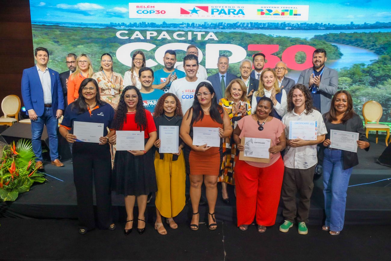 O programa de qualificação do Governo do Pará, para capacitar a mão de obra do estado para a 30ª Conferência das Nações Unidas sobre as Mudanças Climáticas (COP30), já entregou mais de 4.500 certificados – a meta, até a COP, é alcançar aproximadamente 22 mil pessoas. São estudantes que, com seus certificados, recebem um selo da COP30 atestando que estão aptos para suprir a necessidade do mercado e trabalhar em funções ligadas ao turismo, gastronomia, infraestrutura e segurança durante a realização da conferência climática da ONU em Belém.