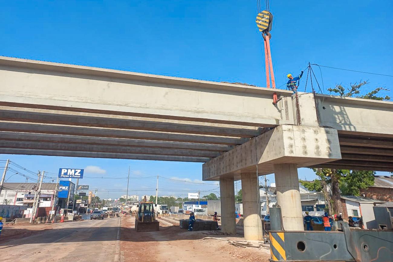 O Núcleo de Gerenciamento de Transporte Metropolitano (NGTM) concluiu o serviço de içamento das vigas do viaduto da Alça Viária com a rodovia BR-316, principal corredor de entrada e saída da capital paraense, nesta quinta-feira, 14. Ao todo, 12 vigas de 50 toneladas e 30 metros de comprimento foram içadas sobre os pilares da estrutura. Agora, as equipes trabalham na construção do tabuleiro (pista) sobre as vigas e nas rampas.