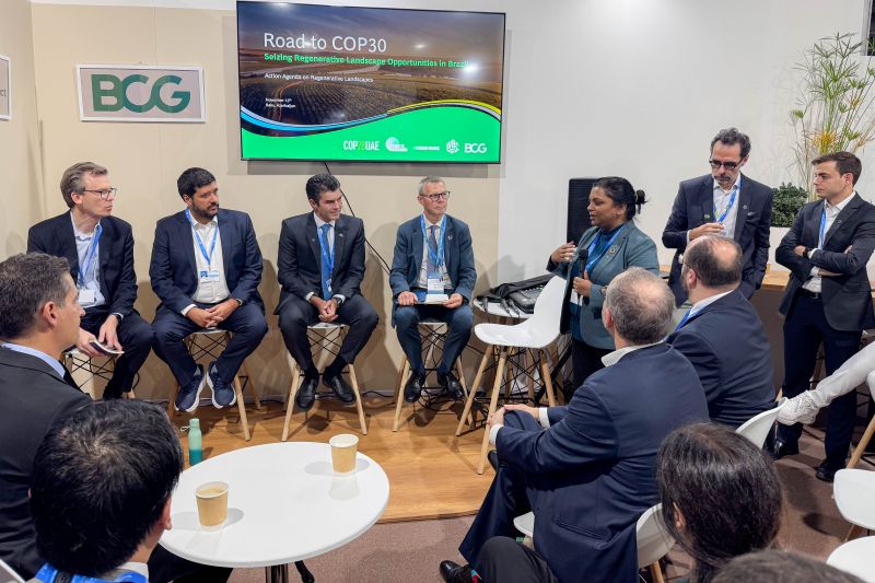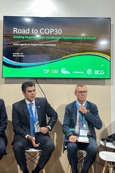 Nesta sexta-feira (15), o governador do Pará, Helder Barbalho, participou do painel que debateu sobre as soluções para a expansão da agricultura regenerativa e sustentável no estado do Pará, durante o evento "Seizing Regenerative Landscape Opportunities in Brazil", promovido pela Boston Consulting Group (BCG) e o World Business Council for Sustainable Development (WBCSD), na Conferência do Clima da ONU, a COP 29.