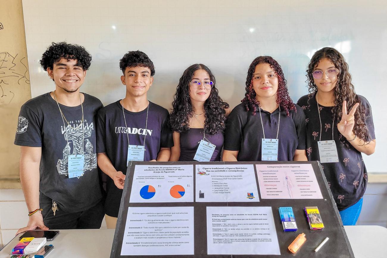 Maria Clara Reis, estudante do 3º ano do Ensino Médio, apresentou o projeto de estudos sobre os riscos do uso do cigarro. “O nosso projeto é sobre o cigarro eletrônico, o cigarro tradicional, o uso na sociedade brasileira e as consequências. A gente estudou sobre a composição do cigarro tradicional e do eletrônico nas aulas de Biologia e Química. Depois, a gente fez uma pesquisa com 50 alunos do Ensino Médio, e pudemos ter um resultado gráfico. Fizemos um painel com as diferenças entre os cigarros, suas semelhanças, e aí a gente começou a fazer um experimento para simular o sistema respiratório do corpo humano quando fuma. Com esse projeto, a gente quer trazer essa sensibilização e o conhecimento sobre os malefícios do cigarro, como ele atua no nosso corpo, e alertar os adolescentes a não usar", informou a aluna.