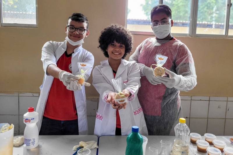 Alunos desenvolveram o projeto de sabão ecológico a partir do aproveitamento de casca de mangaTroca de experiências - A Feira de Ciências abriu espaço para que outras escolas estaduais pudessem expor seus projetos. Uma delas foi a Escola Estadual de Ensino Fundamental e Médio Deputado João Carlos Batista, no bairro do 40 Horas (Ananindeua), que apresentou o Projeto “Economia doméstica e sustentabilidade: a produção de sabão a partir da casca de manga“.