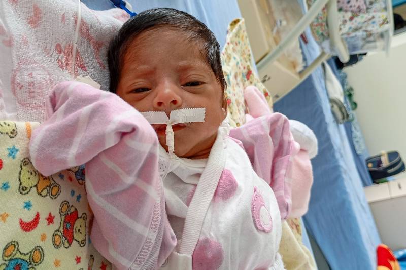 Bella, um dos bebês prematuros, ainda recebe leite humano por sondaDesafios - No caso de bebês prematuros, como Joaquim, os desafios incluem a necessidade de cuidados hospitalares, que interferem na rotina da amamentação; a própria imaturidade do organismo, que dificulta a amamentação no seio da mãe, e as dificuldades da própria mãe de produzir leite materno, pois quando o bebê não suga falta o estímulo natural para essa produção.