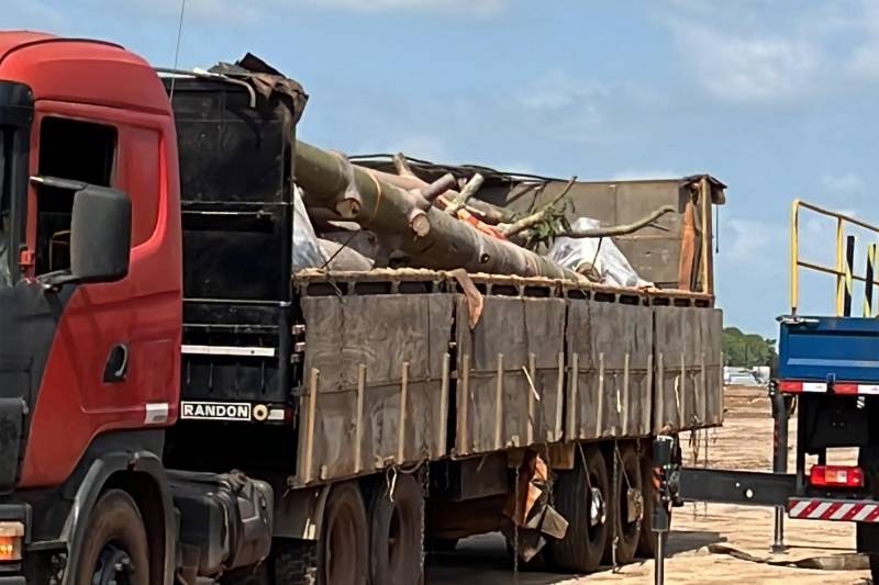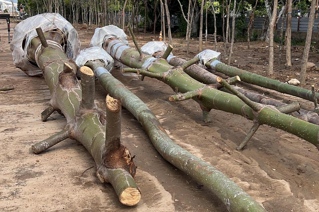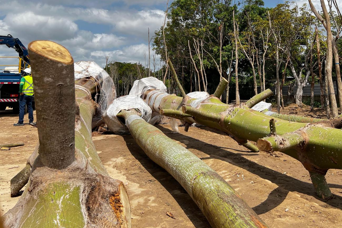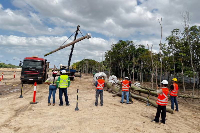Transplante das árvores exige serviço especializado - A maior samaúma do lote tem entre 50 a 60 anos, é considerada uma árvore jovem, pesa impressionantes 4 toneladas, e tem tronco de 1 metro de circunferência e mede 10 metros de altura, exemplificando a monumentalidade e a complexidade do processo de transplante.