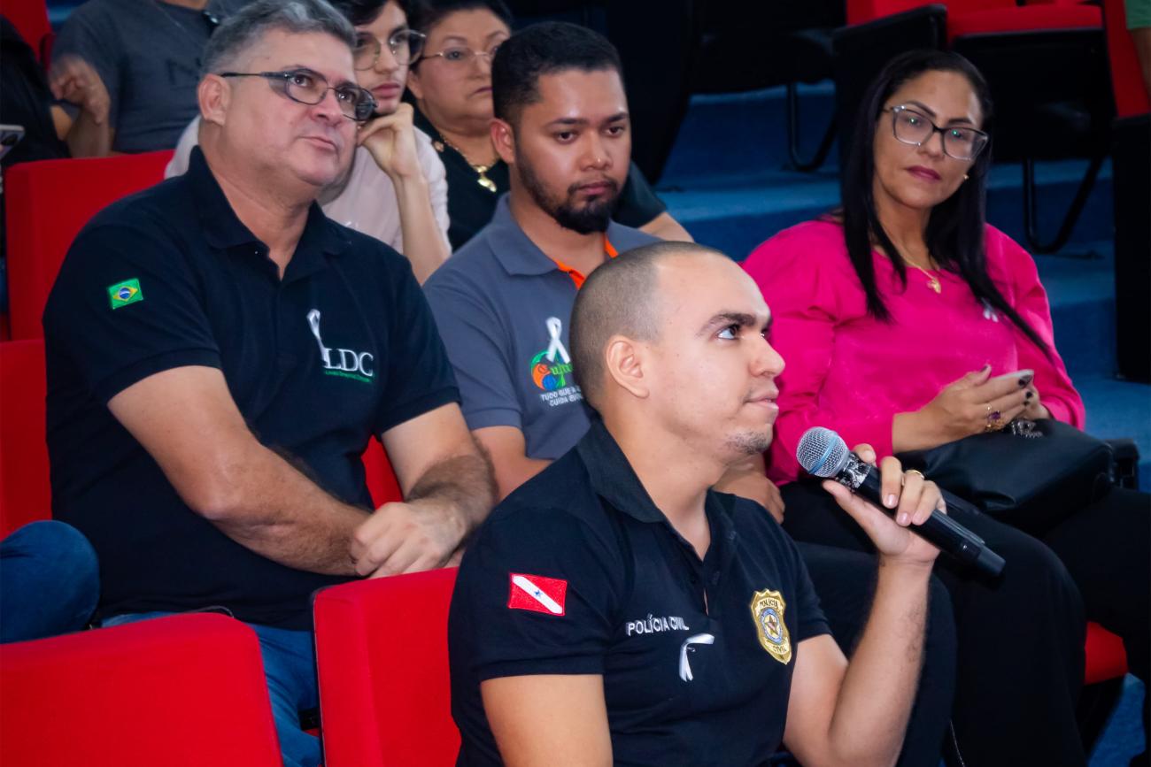 O delegado João Cláudio Sakuno, do gabinete da DAV, representou a PCPA no evento e foi o palestrante da abertura da programação que ocorreu no auditório da Escola Checralla Salim Khayat.