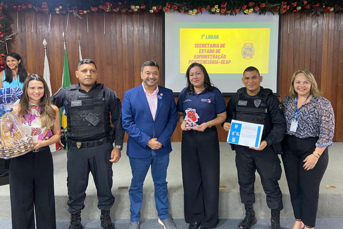 Representando a Seap, estiveram presentes na cerimônia Michelle Holanda, diretora de Assistência Biopsicossocial; Thais Santalices, titular da Coordenadoria de Assistência e Valorização do Servidor (Cavs); policiais penais que participaram da gincana e demais servidores da Cavs.
