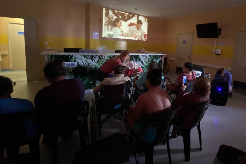Já aproveitando o clima natalino, usuários e acompanhantes assistiram ao filme 'A Princesa e a Plebeia', com direito à pipoca