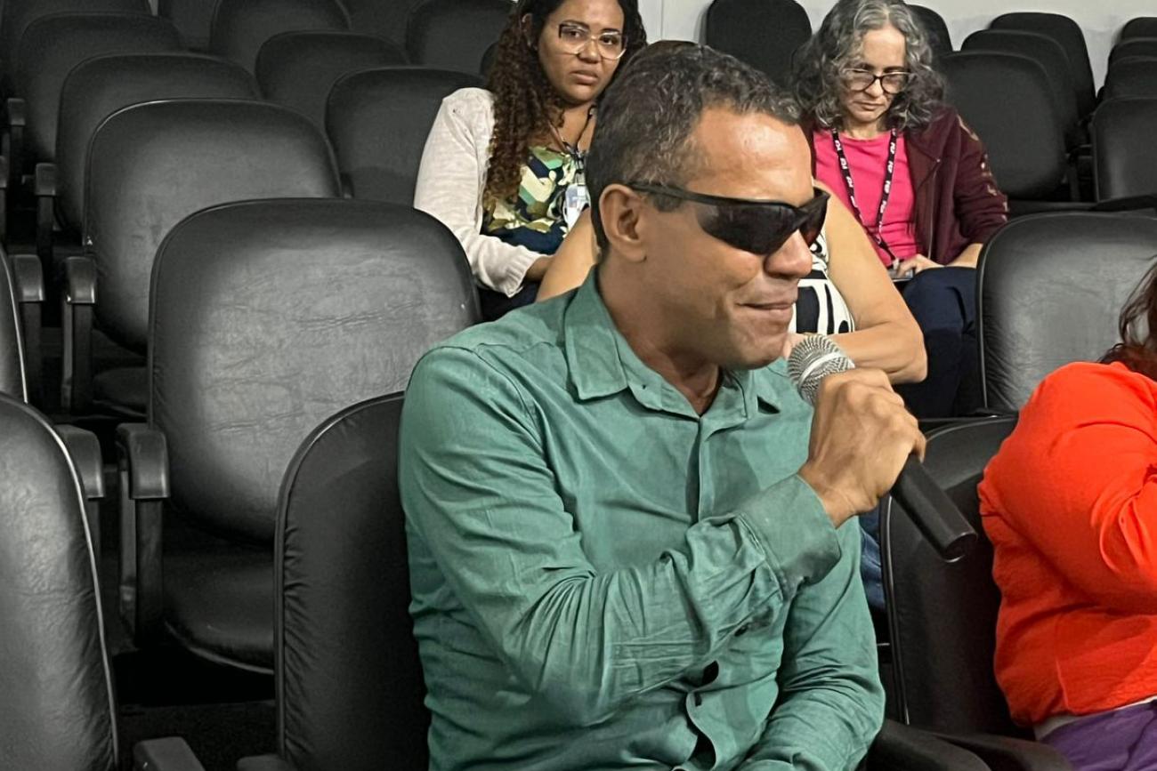 Dailton Conceição, pedagogo da Seção Braille da Biblioteca Pública Arthur Vianna, fala das parcerias da FCP e outras instituições. “Essas parceiras já existem, a gente já tem um trabalho com todas as entidades que estão aqui presentes, esperamos que a gente possa ter por muitos anos para que essa parceria possa continuar”, diz o pedagogo.