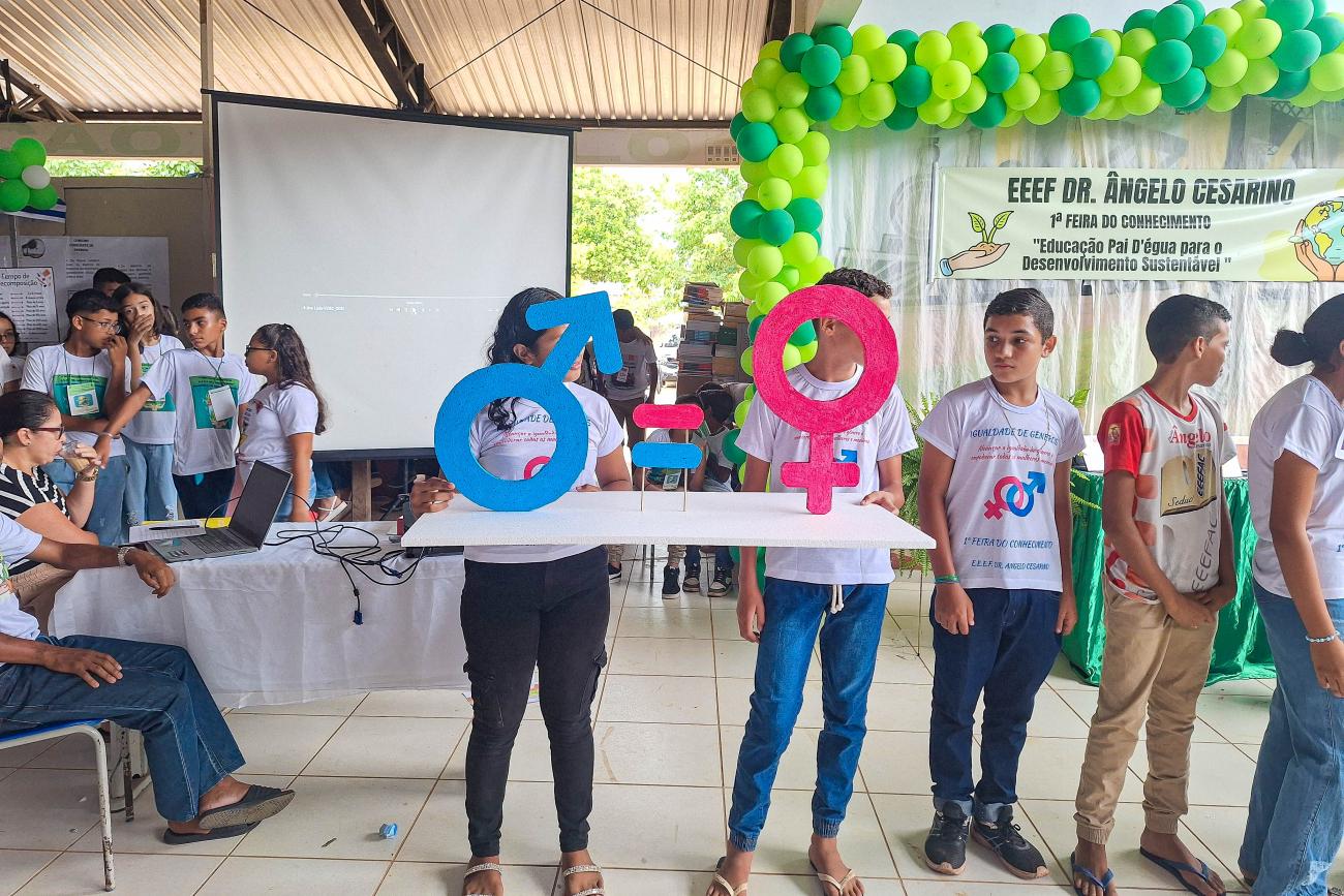 Sobre o tema Igualdade de Gênero, que corresponde ao 5º Objetivo de Desenvolvimento Sustentável (ODS) da ONU, o qual trata do alcance da igualdade de gênero e do empoderamento de todas as mulheres e meninas, os alunos produziram maquetes retratando várias situações de como a mulher ainda é vista com discriminação pela sociedade em determinados ambientes, sejam eles no trabalho, no esporte, ou nas próprias tarefas da casa. A exposição do trabalho foi da turma da aluna Manuela Samilly Teixeira Monteiro.