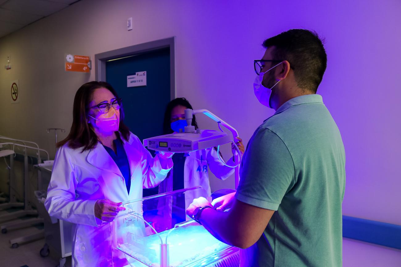 O Hospital foi equipado com 1.200 placas de captação de energia solar. A energia fica armazenada em um conjunto de 100 baterias, garantindo que o complexo esteja abastecido mesmo sem luz solar. “A gente consegue absorver energia para gerar 12 horas de autonomia. Isso alimenta todos os setores – centro cirúrgico, enfermaria e até recepção”, explica Marcelo Frota, engenheiro civil que coordena a área Física e Patrimonial.