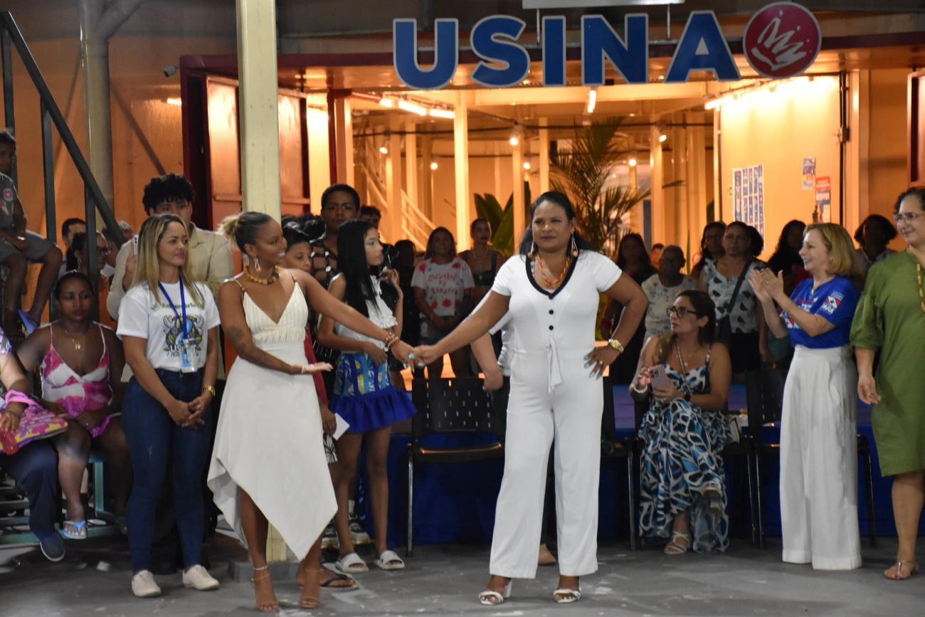A coordenadora do curso, Elis Uchoa, explicou o contexto da atividade que marcou um momento festivo e muito importante para alunos e a comunidade em torno da UsiPaz Terra Firme. “A gente decidiu contribuir hoje com o aniversário da usina organizando o desfile, mostrando todas as técnicas que a gente desenvolveu durante esse semestre com eles, voltado com o foco para a sustentabilidade, com o reaproveitamento de materiais, com técnicas de reciclagem, de fusionagem de plástico, várias técnicas de costura e modelagem diferentes que a gente pudesse mostrar pra eles a pluralidade, a diversidade, a infinidade de formas e coisas que a gente poderia fazer que estejam presente no dia a dia deles”.