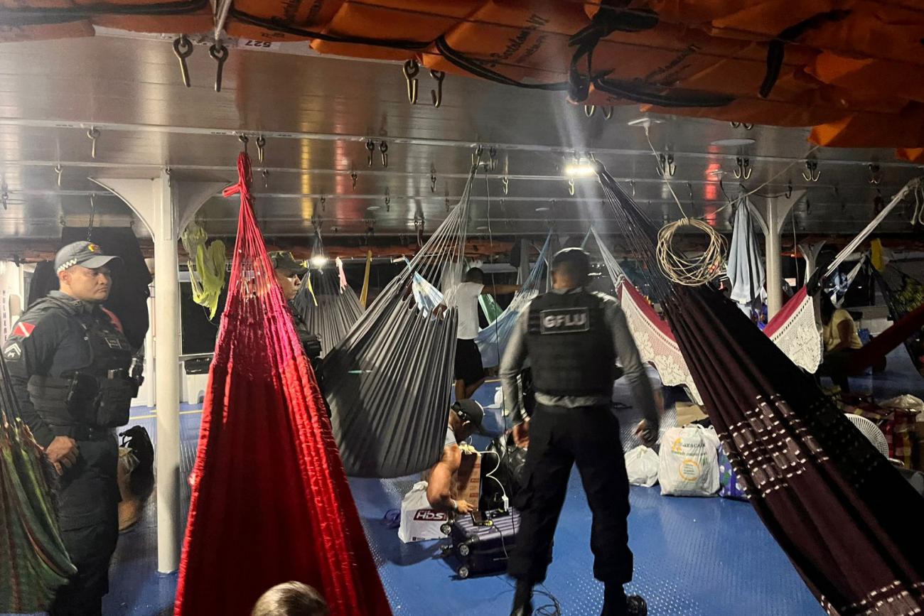 Policiais militares da Base Fluvial de Candiru durante a fiscalização em barco na Base Fluvial do Candiru, no Estreito de ÓbidosNa noite do ultimo sábado, 7, uma equipe da Base Integrada Fluvial ‘Candiru’ deteve um casal que se deslocava em uma embarcação com destino a Santarém, com 21 tabletes de substância do tipo maconha. O homem e a mulher foram detidos, ele foi preso em flagrante e ela foi liberada da prisão porque está grávida, mas responderá ao inquérito em liberdade.