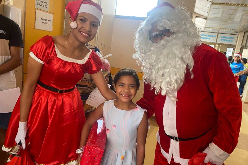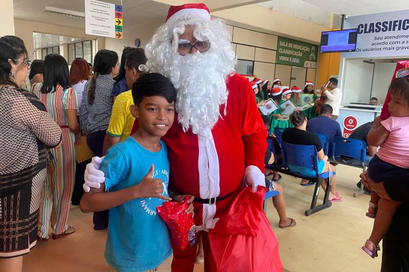 Camila da Silva estava no pronto atendimento do HGT seu filho, Emanoel Vitor, de 9 anos. Durante a visita, Emanoel teve a oportunidade de receber presentes e tirar fotos com o Papai Noel, o que trouxe um momento de alegria para o dia.