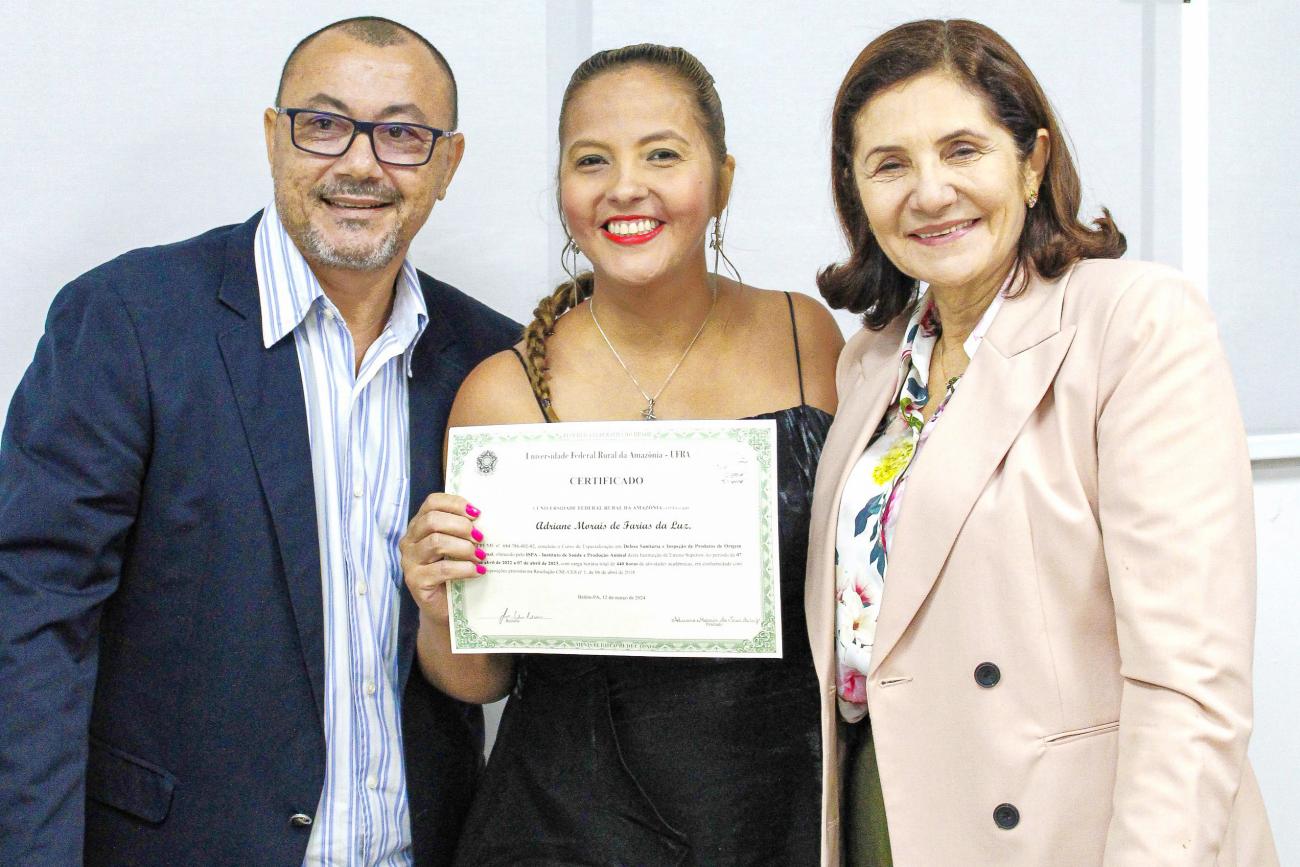 Adriane Moraes com o professor Djacy Ribeiro e Maria AntonietaO médico veterinário Glaucio Galindo, fiscal agropecuário e gerente do Programa Estadual de Ruminantes, foi o orador da turma. Ele destacou a importância do curso para o trabalho desenvolvido pela Agência de Defesa em todo o Estado. “Nós fomos atualizados com relação às técnicas, normas sanitárias e todos os procedimentos a serem adotados. Normalmente nós passamos por capacitações extremamente técnicas, voltadas à atividade de campo, como necropsia, coleta de material, emergência sanitária animal. A oportunidade de fazer uma pós-graduação foi um diferencial para que nós pudéssemos ter um conhecimento abrangente. Estudamos epidemiologia e tantas outras disciplinas, interligando nossas áreas de trabalho aos programas sanitários em atividade, para que a gente pudesse integrar esse rol de disciplinas, de áreas temáticas, para que a gente possa fazer um trabalho mais sólido, mais robusto, tanto de defesa da sanitária animal, quanto de inspeção de produtos de origem animal”, comemorou.
