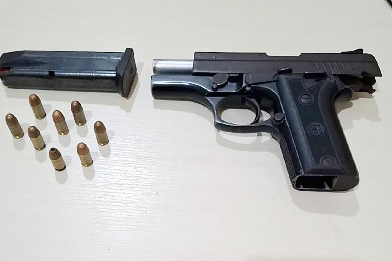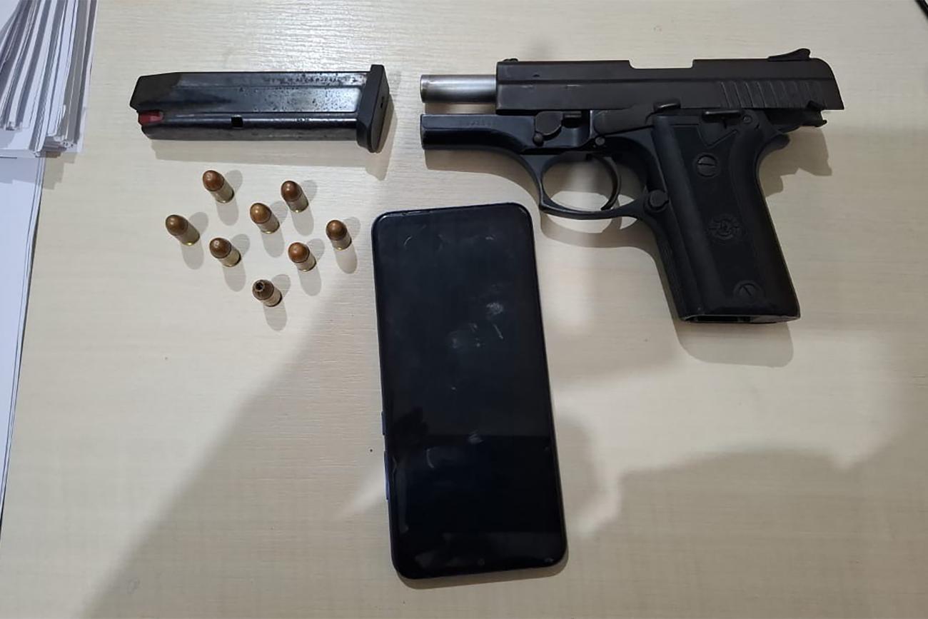 Durante a abordagem, foram encontrados uma arma de fogo do tipo pistola calibre 380, com munições, e um aparelho celular.