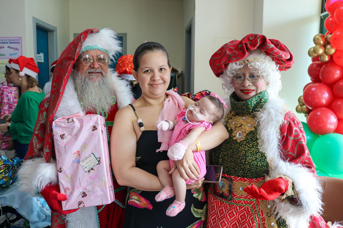 Cada presente foi recebido com alegria pelas crianças e gratidão dos responsáveis, como Ana Caroline Soares, mãe da pequena Ana Laura, que está em tratamento na Santa Casa.