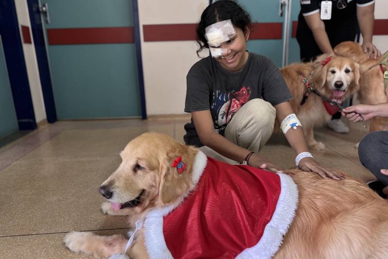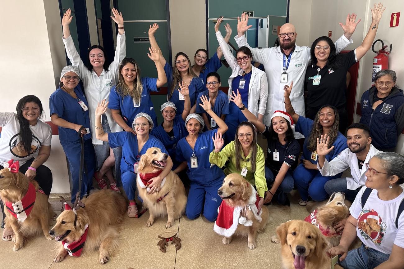 As crianças internadas no Hospital Metropolitano de Urgência e Emergência (HMUE), unidade que pertence à rede de saúde do Estado, vivenciaram um momento especial na manhã desta quinta-feira, 19. A visita dos cães do Clube dos Goldens, que realizam Intervenção Assistida por Animais (IAA) no Pará, compôs a agenda de celebração do Natal no hospital e garantiu aos pequenos e seus familiares descontração e acolhimento.