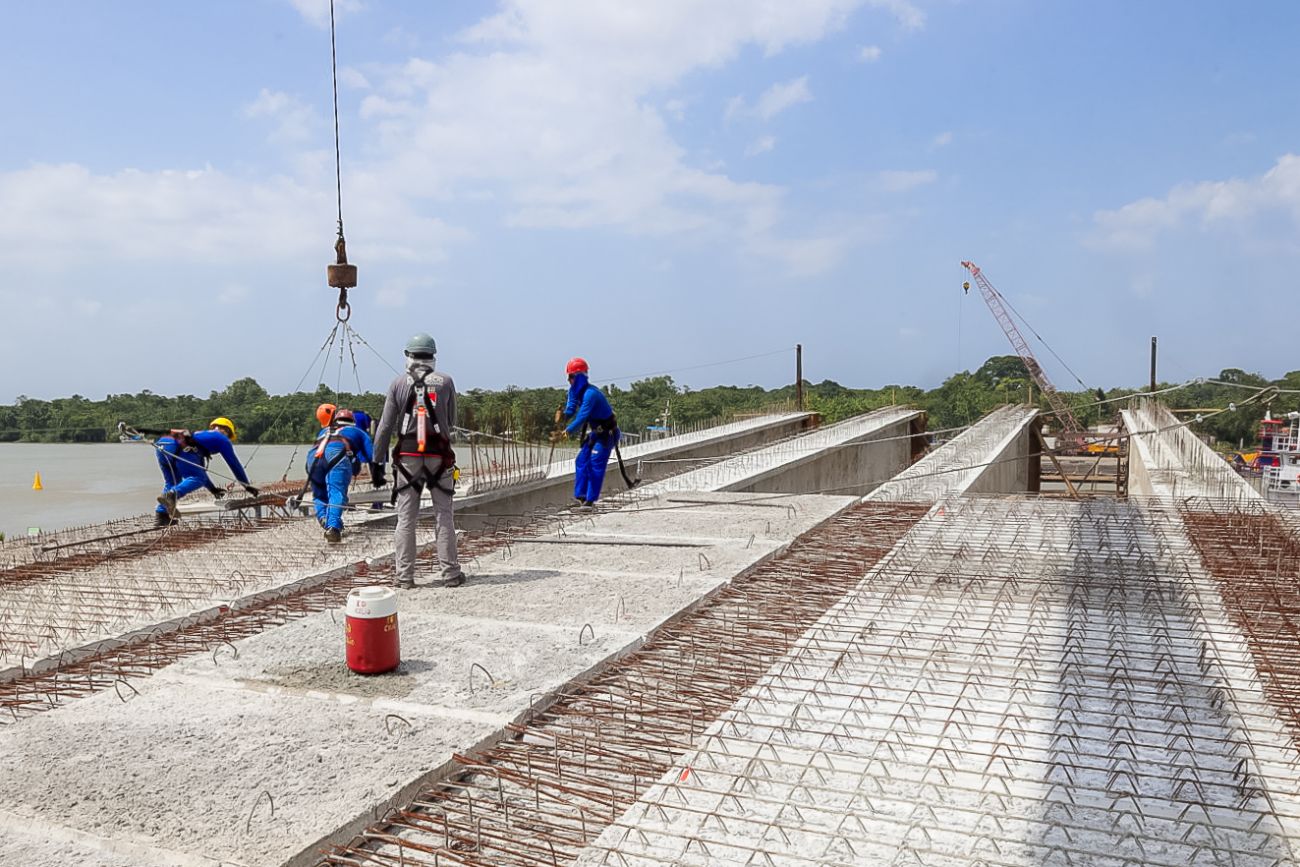 No local, as equipes trabalham intensamente, dia e noite, para garantir que o cronograma da obra seja cumprido, permitindo que a ponte seja entregue dentro do prazo estabelecido.