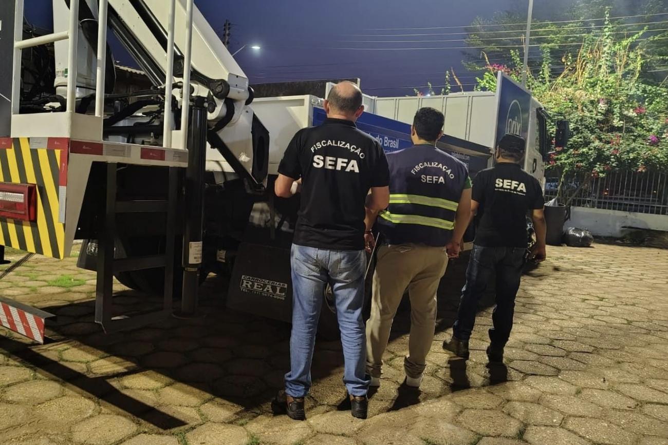 Equipe da Sefa no momento da apreensão do veículo"Durante fiscalização, o caminhão novo foi parado na BR-010 (Belém-Brasília), nas imediações do posto fiscal, e foi solicitada a documentação. O motorista apresentou a nota fiscal tendo como origem e destino a cidade de São Paulo (SP). Como a abordagem ocorreu na entrada do Estado do Pará, a situação foi caracterizada como quebra de trânsito, quando a nota fiscal informa um destino para a carga e ela é entregue em outro local”, explicou Gustavo Bozola, coordenador da unidade Itinga.
