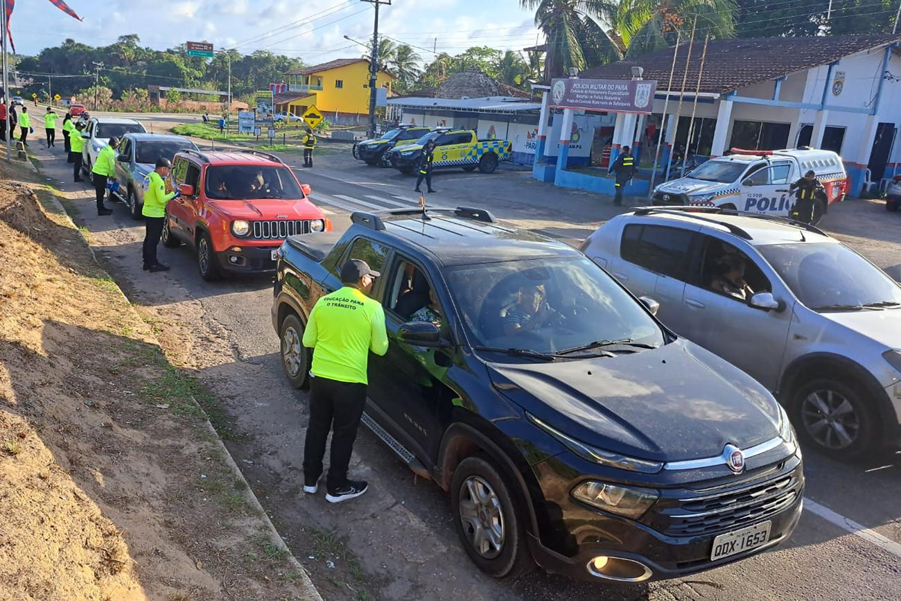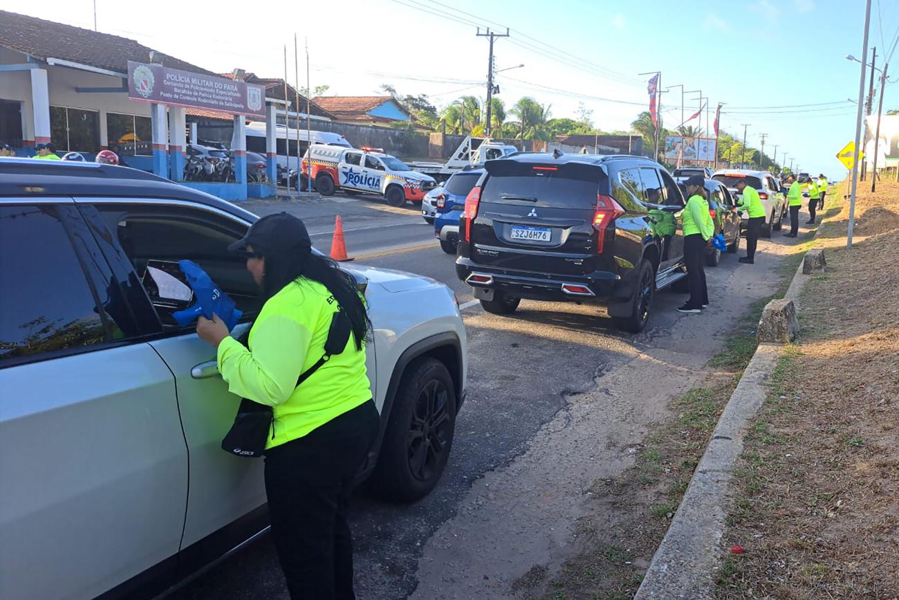 Em Salinópolis, no nordeste paraense, os servidores da Educação realizam as abordagens na PA-124, principal via de acesso ao município. Além das orientações gerais de segurança, os servidores atentam para os horários de maré alta e o não descarte de lixo nas vias públicas.