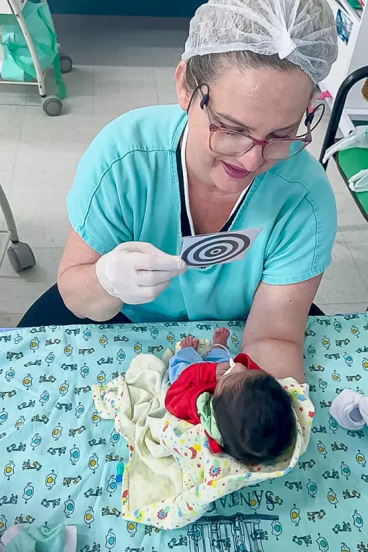 “A gente vai ajudar na orientação dos cuidados, como a questão da troca de fralda, que é diferenciada, a questão do banho, do posicionamento do bebê, a própria interação que esse bebê tem com a família, esse contato, a forma como a família pode ajudar na organização do comportamento desse bebê, quando é que a família pode interagir. Orientamos também sobre o processo do aleitamento materno, pois a alimentação é uma atividade de vida diária dessa criança, então a mãe está ali na questão de provedora dessa alimentação, e que isso também é um processo de construção e de conhecimento tanto da família quanto do bebê”.