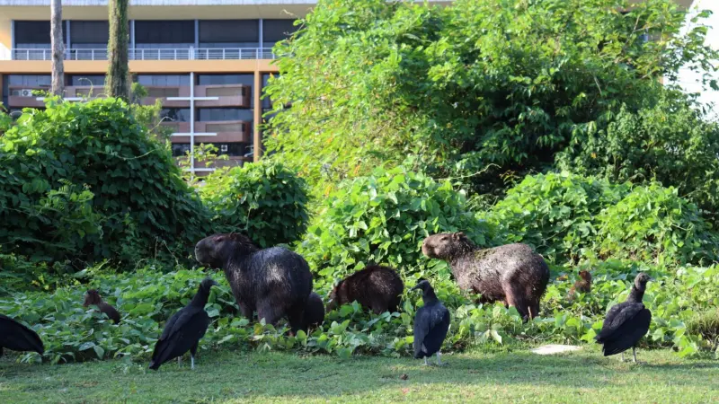 Para além da aparência dócil e comportamento tranquilo, que as deixaram famosas nas redes sociais, as capivaras são essenciais para o ecossistema. Como herbívoros, alimentam-se de plantas aquáticas, folhas, frutas e cascas, controlando o crescimento da vegetação. “Sem herbívoros, seria impossível caminhar pelas áreas verdes do PCT e do campus, pois eles renovam a vegetação. Seus dejetos, ricos em nutrientes, fertilizam o solo e auxiliam no reflorestamento, funcionando como um adubo natural”, explica a pesquisadora.