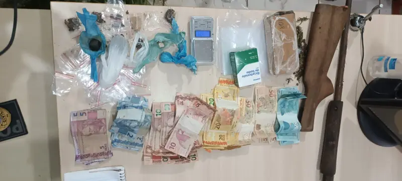 Durante a abordagem, o homem revelou que armazenava entorpecentes em sua casa, no bairro Boa Vista. A equipe policial realizou buscas no imóvel e encontrou, em uma área externa, uma substância semelhante à maconha pesando cerca de 402 g, quatro papelotes de maconha (20 g), uma porção de crack (14 g), uma porção de substância conhecida como K9 (10 g), R$ 1.862,00 em espécie, uma balança de precisão, um simulacro de pistola, uma espingarda de fabricação caseira e invólucros usados para embalar drogas.
