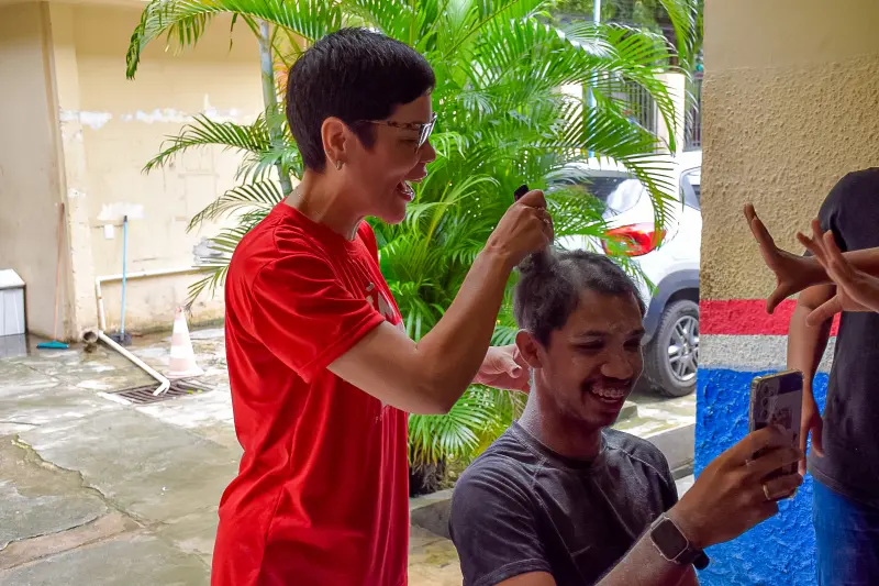 A vitória dos alunos irradia o corpo docente. Mara Campelo é vice-diretora da EETEPA Vilhena Alves e não segurou as lagrimas ao falar sobre o significado do dia de hoje. “O sentimento primeiro é de arrepiar. O segundo é você se ver nesse momento, é uma escola pública que tem uma a trica loura, é um sentimento que não cabe no peito porque é de família humilde e tá aí provando que é possível. O Vilhena Alves é uma escola acolhedora, inclusiva, e aí a gente vem apoiando de todo jeito, de todas as formas, do modo que a gente pode. Nenhum salário paga a gente vê hoje essa festa, alegria desses meninos, e eles são protagonistas dessa história. Então, a gente só tem nesse momento é alegria mesmo, festejar, brincar com eles e, já dissemos para eles, retornem para contribuir com esse conhecimento que vocês estão buscando lá fora”.