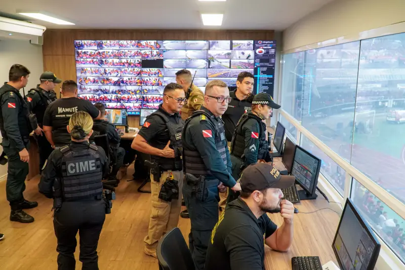 O esquema de segurança para a partida entre Flamengo x Botafogo, na final da SuperCopa Rei 2025, no Novo Mangueirão, foi reforçado para receber, neste domingo (2), cerca de 45 mil pessoas em mais um clássico do futebol nacional. Para acompanhar a chegada do público e o entorno do estádio, o Centro de Comando Operacional (CCO) está ativado com o objetivo de concentrar o monitoramento de imagens de cerca de 800 câmeras instaladas dentro e no entorno do estádio.