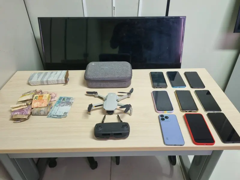 Durante a operação, cinco mandados de busca e apreensão foram cumpridos, resultando na apreensão de uma motocicleta, nove celulares, um tablete de substância semelhante à maconha, um drone, uma TV e a quantia de R$ 3.872,00.