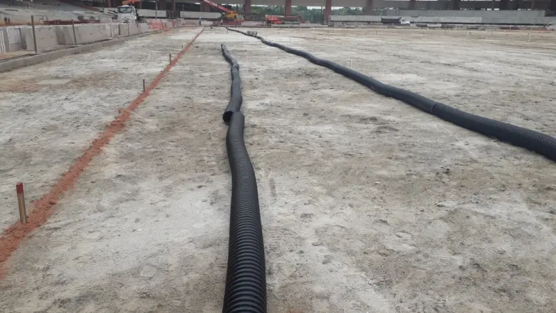 O cálculo da drenagem do Novo Mangueirão levou em consideração quatro variáveis importantes para a plena funcionalidade do sistema: vazão projetada em litros por segundo, área da superfície a ser drenada em metro quadrado, índice pluviométrico e o tempo de recorrência de chuva no gramado.