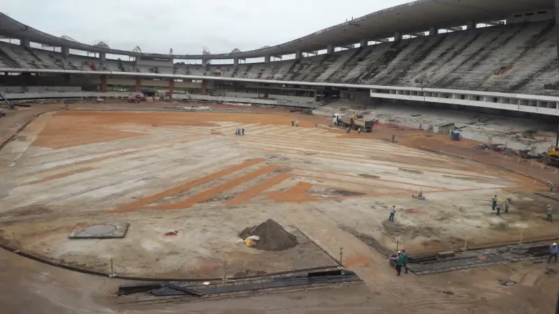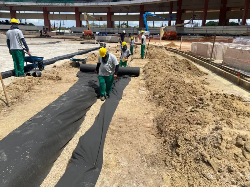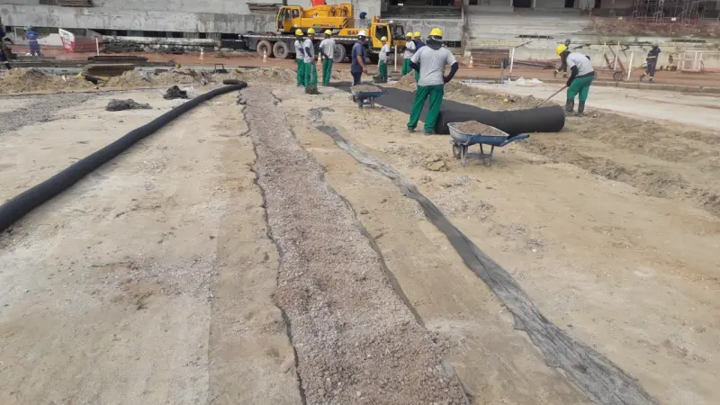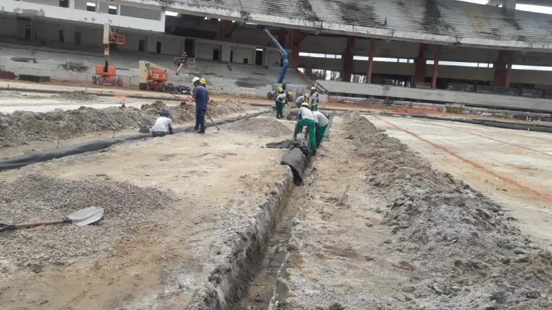 “Projetamos o local de jogo do Novo Mangueirão dentro das normas e condições aceitáveis de utilização da grama e drenagem. Existem excepcionalidades, por exemplo, como a chuva de domingo, que foi intensa. Entre o gramado e os tubos que estão enterrados para receber essas águas existe uma distância considerável, que é preenchida com grama, areia grossa, seixo fino e grosso. Há um tempo entre a água sair da grama e chegar dentro dessa tubulação, que é toda perfurada. E as poças de água se formam porque o solo satura. Com a eficiência de todo esse processo do Novo Mangueirão, nós tínhamos a certeza que o gramado iria responder ao que aconteceu no jogo entre Flamengo e Botafogo, como já havia respondido em outras ocasiões”, explicou o secretário de Obras Públicas, Ruy Cabral, que liderou a última modernização do estádio.