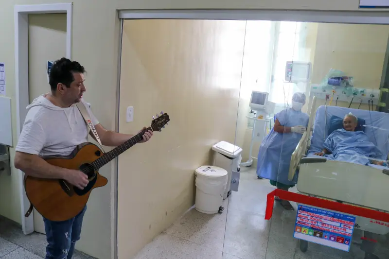 Romualdo Bahia, técnico de enfermagem da Santa Casa, durante sua apresentação no Sarau da UTI, fez uma fala sobre a importância desse momento: “Após a gente estar pensativo, às vezes escutamos uma música, e é aquela música que consegue entrar no nosso coração de uma forma que faz com que ela nos alegre. Eu imagino que seja um momento difícil para quem está aqui internado ou acompanhando seu parente ou amigo. Acredito que a primeira coisa que passa na cabeça do paciente é essa dúvida se a gente vai retornar para casa ou não. E neste momento a música ajuda muito. E aqui é um momento em que o paciente pode pensar no alívio. Pensar nas músicas que se gosta. Pensar nas letras que se gosta”.