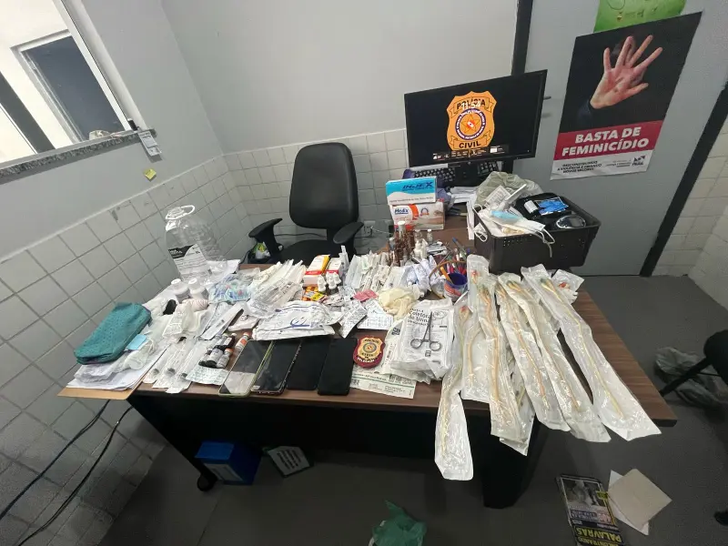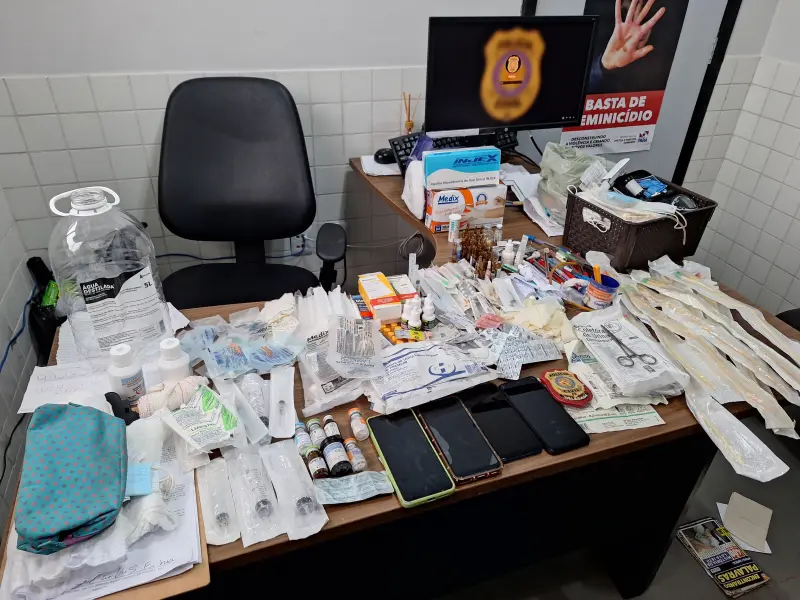 Na residência, foram apreendidos os aparelhos celulares da investigada e diversos materiais médicos e hospitalares, usados no procedimento do aborto ilegal, como sondas foley em látex siliconizado, grampo umbilical, pomadas e ampolas de medicamentos.