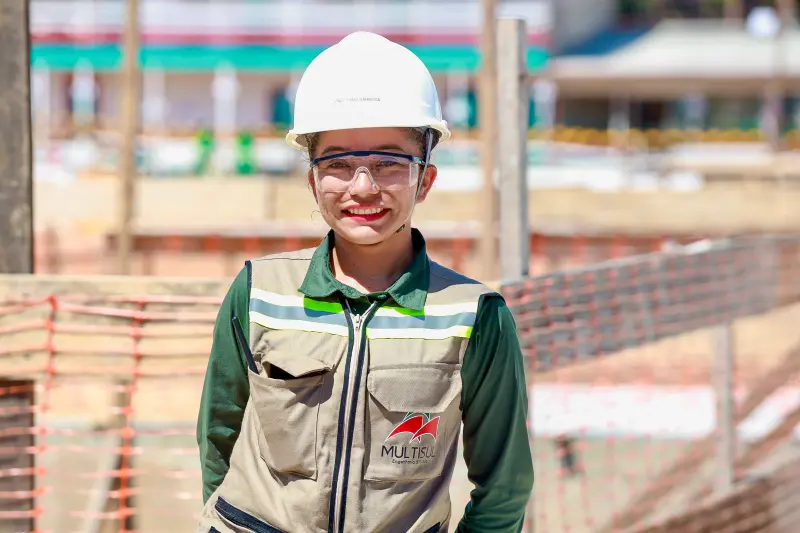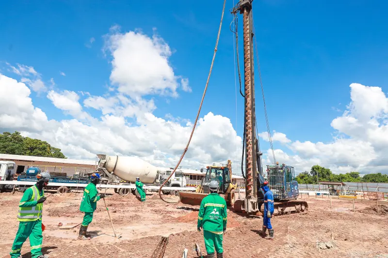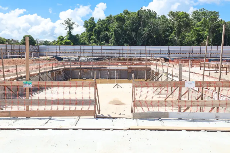 "Esse percentual representa a execução de estaca hélice contínua nos ativos Complexo Poliesportivo, Usina e Assistência, execução de blocos de concreto armado dos ativos, execução da estrutura da piscina, inclusive o deck, alvenaria de bloco de concreto da guarita e casa de bombas e assim como a quadra de areia. Também foram feitos serviços de terraplanagem e também a execução da drenagem subterrânea em manilha de concreto armado e poços de visita", informa a engenheira de Qualidade, Thaís Barbosa.