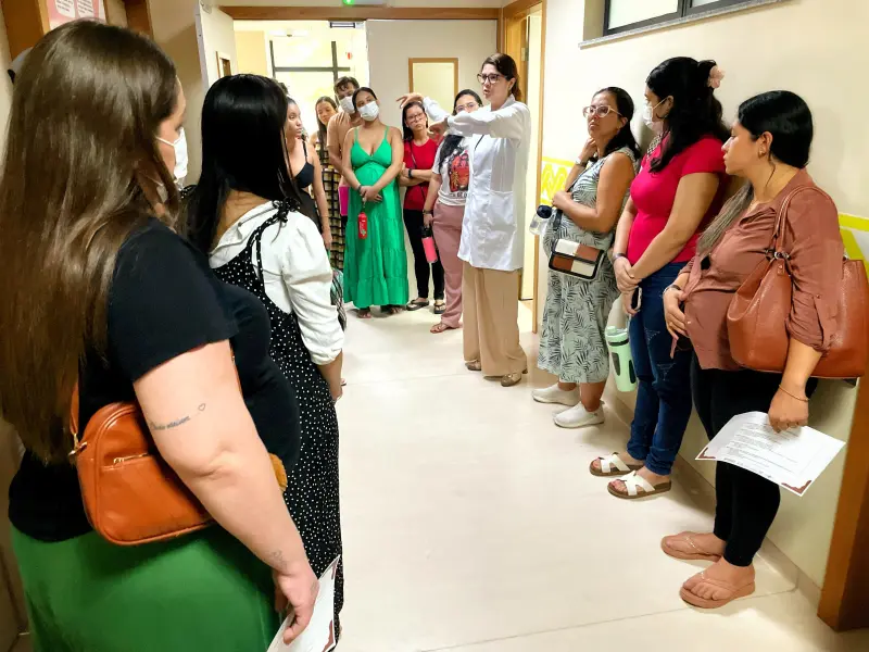 A visita guiada integra as iniciativas do curso "Laços de Amor", promovido pelo Comitê de Humanização (CH) do Hospital Abelardo Santos. Realizado bimestralmente, o programa pretende orientar gestantes e seus familiares sobre temas essenciais relacionados ao parto e aos cuidados com o recém-nascido e é conduzido por profissionais assistenciais e administrativos.