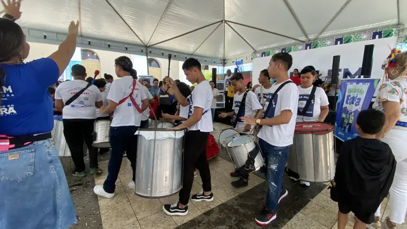 Bateria das Crias do Curro Velho arrastam foliões no 'Bloquinho Inclusão Folia'