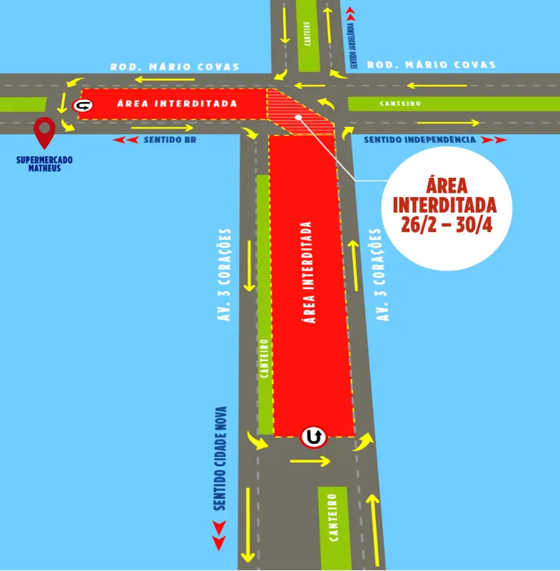 Já os motoristas que seguirem pela Mário Covas, sentido Independência-BR, e também pela Três Corações, sentido Jaderlândia-Cidade Nova, precisarão fazer o retorno próximo a um supermercado.