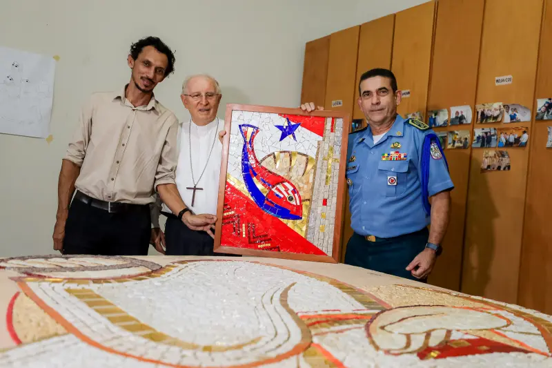 “Aqui encontramos a bandeira do Pará, o peixe, que é símbolo de Cristo, o pão, que representa o trabalho humano, e elementos da cultura marajoara. É uma homenagem feita por nossos artistas, que levam sua arte para o Brasil e o mundo”, explicou o bispo Dom Carlos.