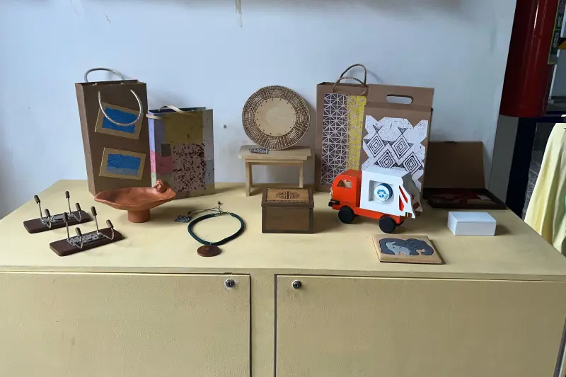 As oficinas também têm um forte viés sustentável. Na oficina "Do Papel ao Produto", por exemplo, os alunos aprendem a reciclar papel e a adicionar fibras naturais, como a pupunha e o curauá, para aumentar a resistência do material. Além disso, o núcleo tem experimentado com papel-semente, uma inovação que permite que o papel germine após o uso. "Quando o aluno coloca a primeira camada do papel no tanque, ele joga as sementes desidratadas dentro do papel. As sementes podem ser de maracujá, cheiro verde, ou outras que estamos testando. Quando o papel é rasgado, as sementes ficam expostas e, se colocadas em um lugar úmido, germinam. É um processo simples, mas muito interessante", explica Ana.