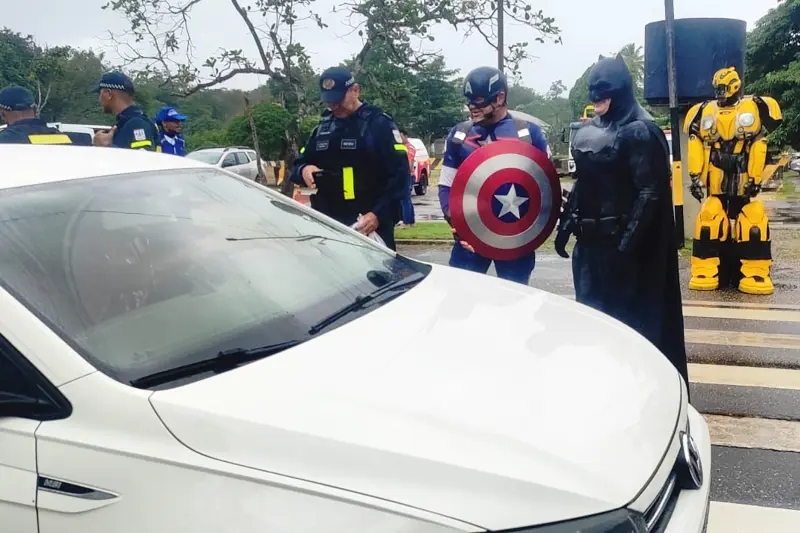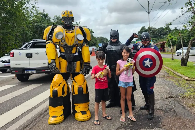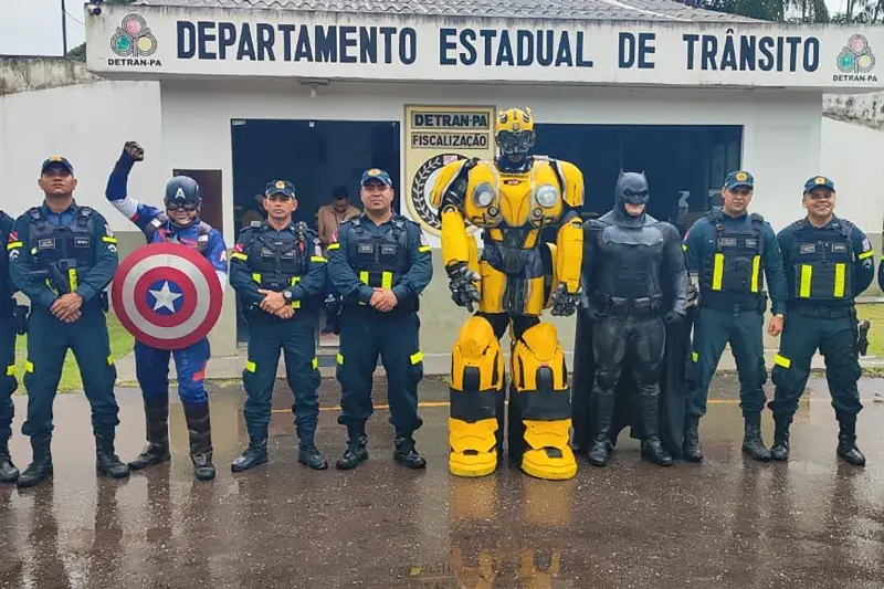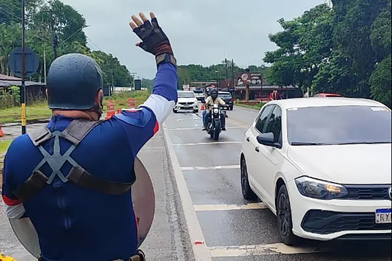 Na manhã do domingo (2), uma ação educativa foi realizada na PA-391, em Mosqueiro, com a participação das equipes do EducaTrânsito, do Departamento de Trânsito do Estado (Detran) e do projeto Cosplay do Bem. A iniciativa conta com militares do BPRV fantasiados de super-heróis, que interagem com o público, especialmente com as crianças, para transmitir informações sobre segurança viária.